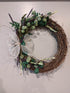 Each wreath is handmade and a unique piece that will be a conversation starter in your home. Grapevine wreath is 14 inches. Indoor/outdoor use(make sure patio is covered). This is great for all year round. Pretty greenery and shades of purple flowers with a pretty handmade bow.
