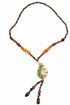 Colored glass beads in this gypsy style shimmer necklace, nice to wear along with dark rich colored sweaters and blouses. The pendants come in various styles with a generous amount of golden shimmer and other colorful swirls right down to the split beaded closing, with 2 lustrous black drop beads.